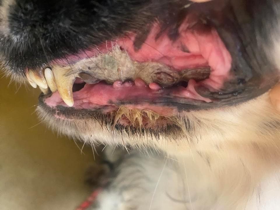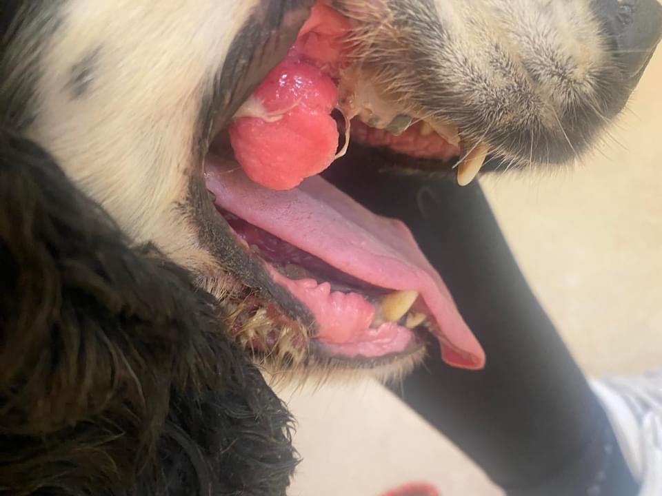 She has had to have every single tooth barr 2 removed. The mass was removed and has been sent away for analysis and is not cancerous. There was chronic inflammation noted - probably from her awful teeth but this could be due infection or destruction of jaw bone underneath. She has been on antibiotics so this would combat the infection but we will x-ray her jawbone during her next mammary tumour removal to confirm whether there is a more serious issue going on with her jaw.